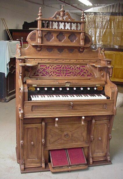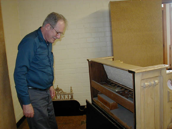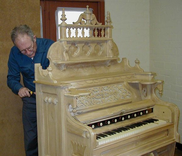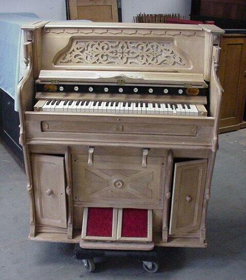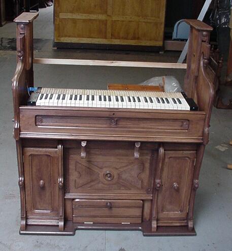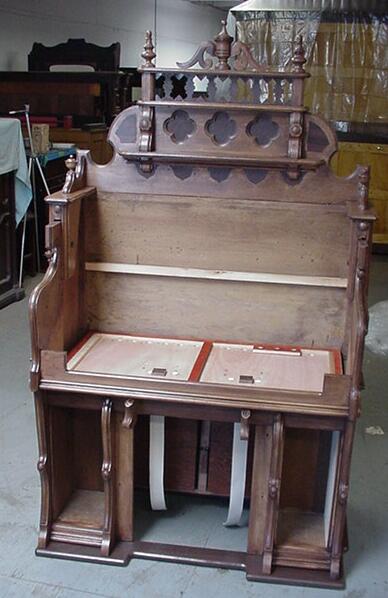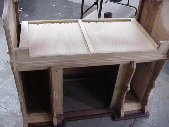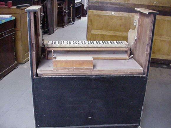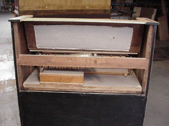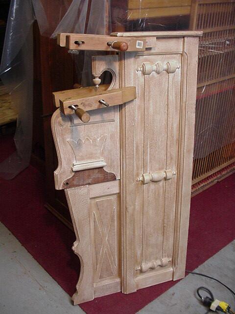 The lower action had to be re-fitted before re-staining the case. Shoninger always used the reverse-style lower action; the lower back of the organ is part of the reservoir.