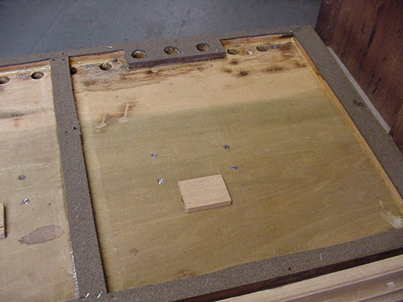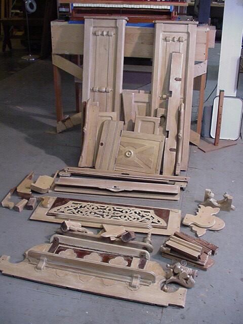 Many other repairs on the case were necessary. Note that in this picture, the case has come back from the stripper: it doesnt look much different, because the white first-coat of the antiquing sank deeply into pores of the walnut.