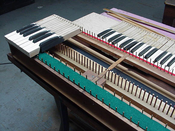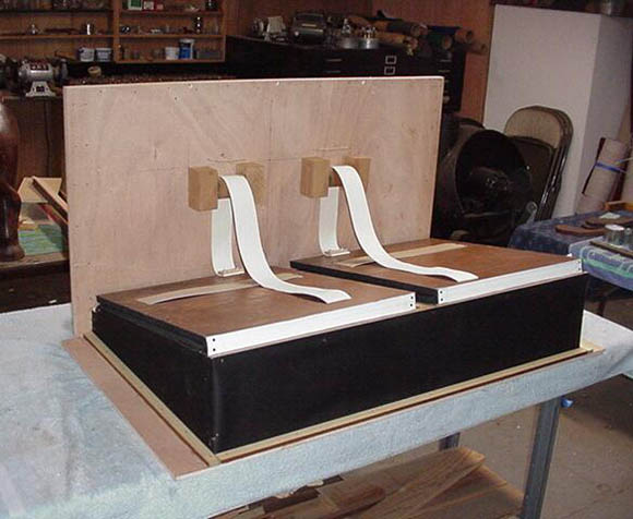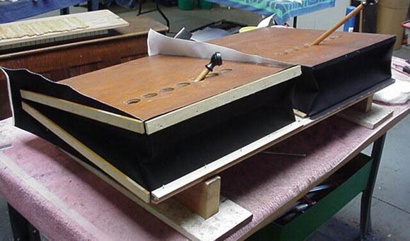 The organ beginning to look like an organ again. Note the leather gaskets on the brand-new foundation.