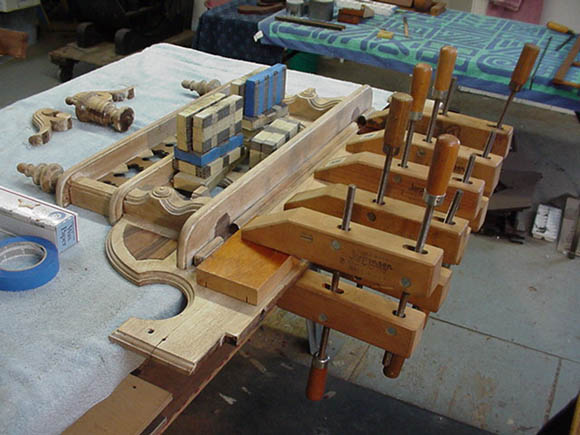 The thin veneer appliques on the crown had peeled away, and were replaced: here the glue is setting up under clamps.